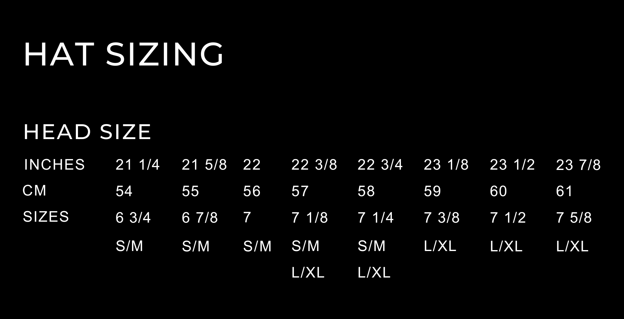 | Head Size | S/M | S/M | S/M | S/M - L/XL | S/M - L/XL | L/XL | L/XL | L/XL |